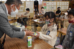 [写真/フッ化物洗口剤のサンプルを受け取る中央小の児童 ]