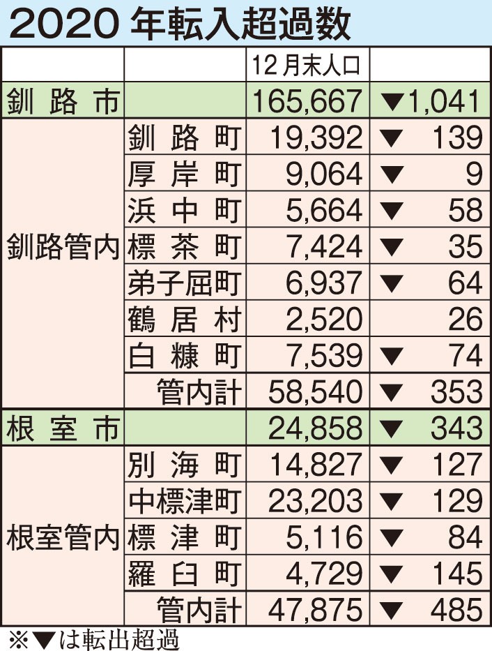 - 鶴居村唯一転入超過、釧路市は道内最多1041人転出(2021-02-08)