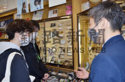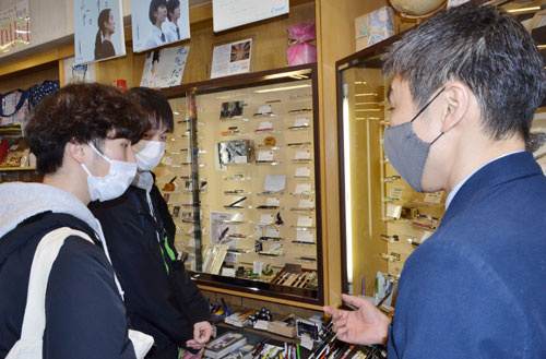 [写真/佐藤紙店の佐藤公一郎社長(右)から万年筆の説明を受ける学生 ]