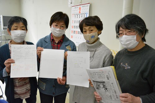 [写真/「クレインズ今昔物語」を点訳した斉藤さん(左から2人目)と、校正を担当した釧路市点訳奉仕はなあかり会のメンバー ]