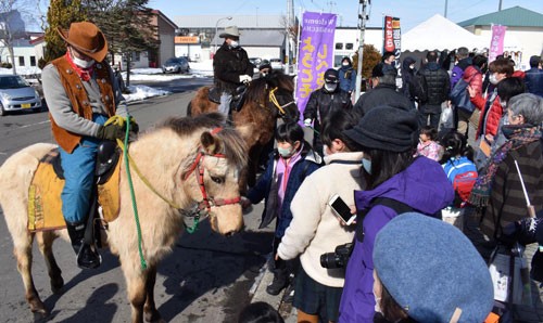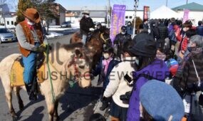 [写真/標茶駅前で馬と触れ合うSLの乗客 ]