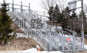 [写真/大楽毛北部の釧路新道につながる緊急避難階段。土岐会長は「行き着くまでの距離や道路幅に難があり、大楽毛南部の住民や高齢者がたどり着くのは難しい」と話す ]