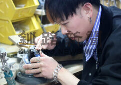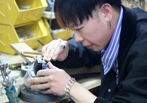 [写真/工房でフェザーリングを製作する大谷さん ]