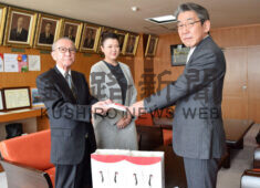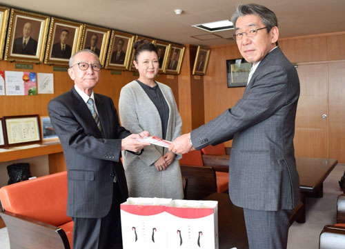 [写真/目録を手渡す長谷社長(左) ]