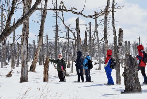 [写真/ツアーをつくったガイドの石下亜衣紗さん(左)を先頭に、イヤホンで音声を聞きながら観察する ]