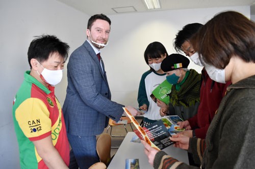 [写真/アイルランドの観光パンフレットで自国の魅力を紹介するルークさん(左から2人目) ]