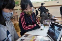 [写真/エゾシカが餌を食べる映像を確認する児童 ]