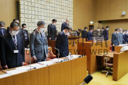 [写真/議会を中断し、黙とうを捧げる石垣市長ら ]