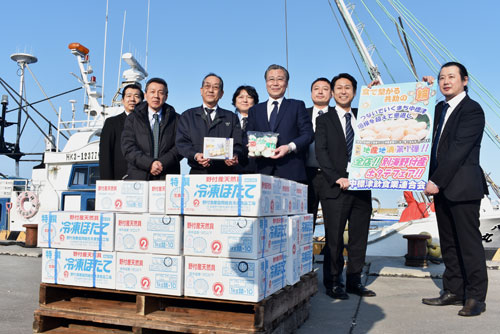 [写真/野付漁協から購入した冷凍ホタテを手に加藤会長(前列中央)ら ]