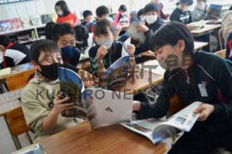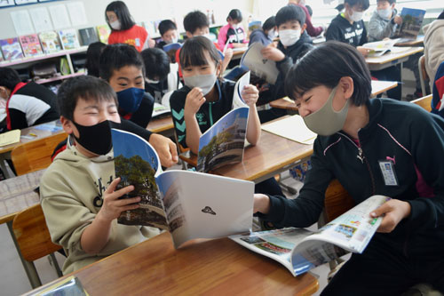 [写真/開校50周年記念誌を笑顔で観覧する児童ら ]