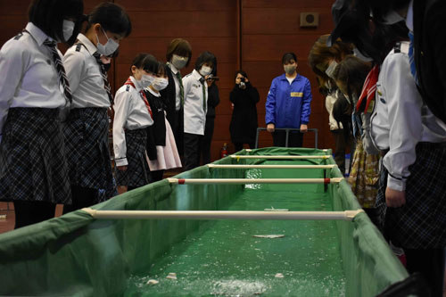 [写真/実験装置を使って津波の仕組みを学ぶ参加者ら ]