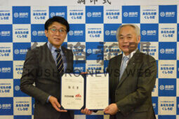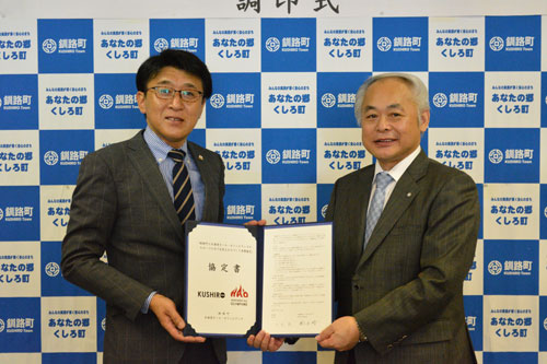 [写真/協定書を取り交わす小松町長と鈴木ゼネラルマネジャー(右から) ]