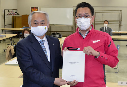 [写真/提言書を手に小松町長(左)と斎藤会長 ]