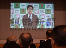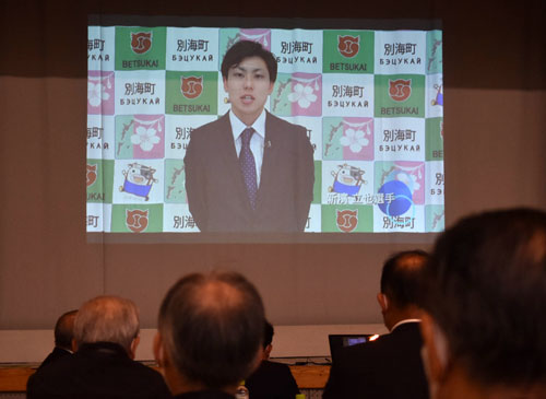 [写真/総会では郷選手に続き新濱選手から、新後援会設立に感謝するビデオメッセージが上映された ]