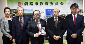 [写真/映像資料の寄付受納式を終え(右から)岡部教育長、貝塚会長、片桐副会長、高野事務局長、小田事務局長補佐 ]