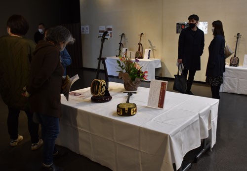 [写真/琉球王朝から伝わる伝統的な七つの型の三線が並ぶ会場 ]