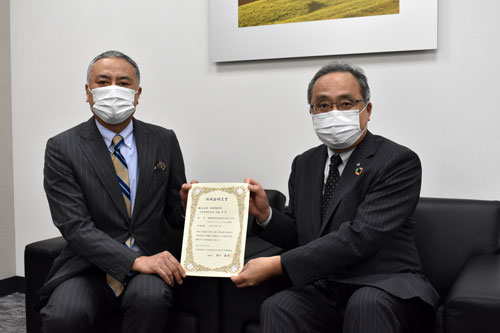 [写真/羽刕社長(左)に助成金贈呈書を手渡す森山支店長 ]