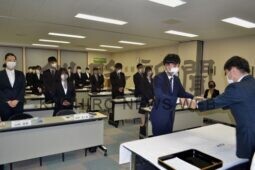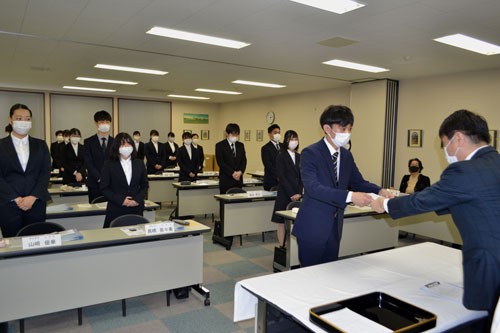 [写真/佐藤社長(右)に宣誓書を提出する新入社員 ]