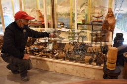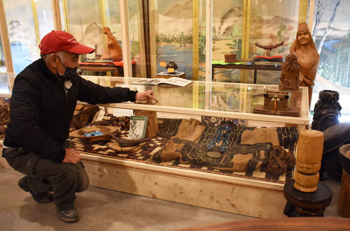 [写真/貴重なアイヌ民族の織物について説明する中野さん ]