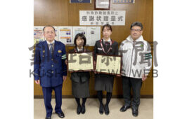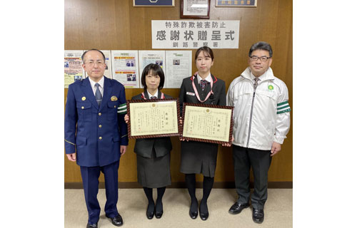 [写真/奥村署長(左)から表彰を受けた片岡課長代理(中央左)と佐々木さん ]