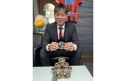 [写真/福司の酒かすを使ったアイス「くしろ愛すくりーむ」をPRする松野社長 ]