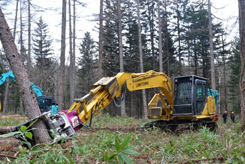 [写真/立木の伐倒や運搬、作業道の設置などがバックホウ1台で可能になるアタッチメント「フェラバンチャザウルスロボ」。木の根元をつかみ、切り倒す ]