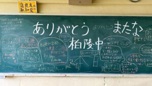 [写真/公開された教室の黒板にはOB、OGが思い思いの感謝の言葉を並べた ]