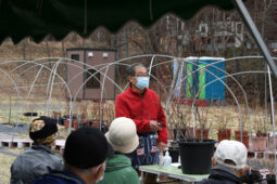 [写真/苗木の剪定のこつを教える横田代表 ]