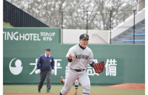 [写真/【準決勝、釧工業―別海】6回から登板、6イニング自責点ゼロの釧工業山田。最後の打者から三振を奪い、勝利の雄たけび ]