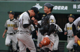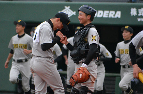 [写真/【代表決定戦、釧北陽―釧工業】9回完投した釧北陽の富樫(左)。バッテリーを組む鎌田と勝利のグータッチ ]