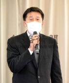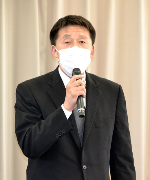 [写真/抱負を述べる松村新会長 ]