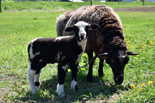 [写真/母親に寄り添う牛柄の子羊(左) ]