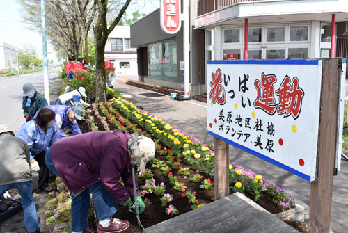 [写真/色とりどりの花の苗植え作業を行う参加者(美原地区社会福祉協議会) ]