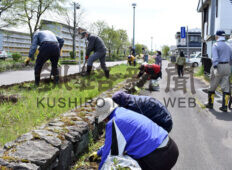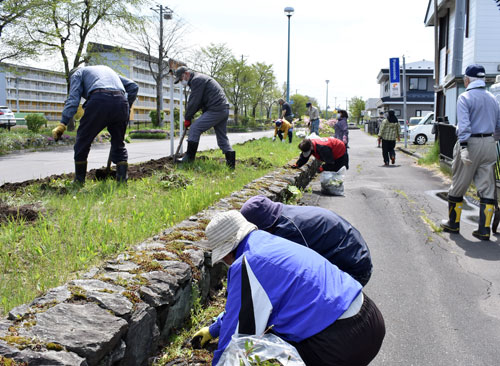 [写真/花の苗植えに備え土起こしと雑草取り作業を行う会員(美原2丁目町内会) ]