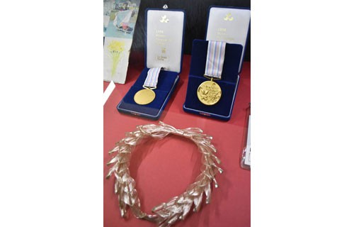 [写真/長野パラリンピック・男子アイススレッジスピードレースで武田さんが獲得した金メダルと月桂冠 ]