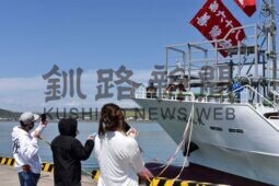 [写真/家族や関係者ら多くの見送りを受けて漁場へ向かう曳き網漁船の「第68善龍丸」 ]