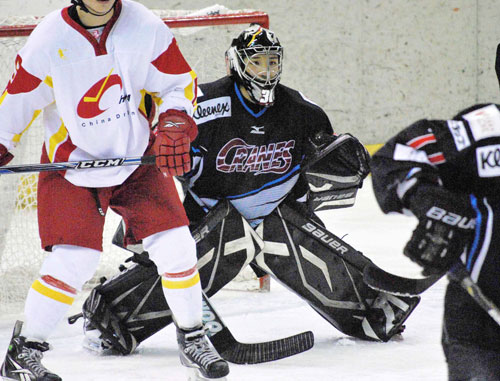 [写真/アジアリーグ公式戦初の先発マスクで60分間フル出場を果たし勝利に貢献したクレインズGK大嶋の体を張ったプレー ]