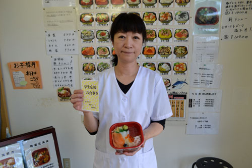 [写真/学生お食事券と海鮮丼を手に、困窮している学生らの来店を呼び掛ける上梨代表 ]