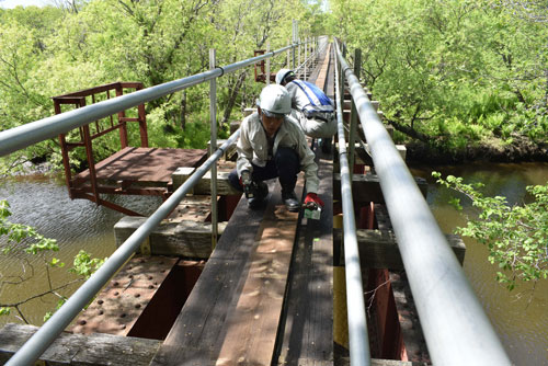 [写真/寺井建設の従業員の協力で改修される旧標津線の鉄橋(9日午後1時ごろ) ]