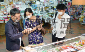 [写真/MOO内の北匠で水産加工品を見学する岡田氏、山崎氏、川島氏(左から) ]