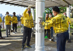 [写真/阿部会長(手前左)も作業に加わった支柱のペンキ塗り ]