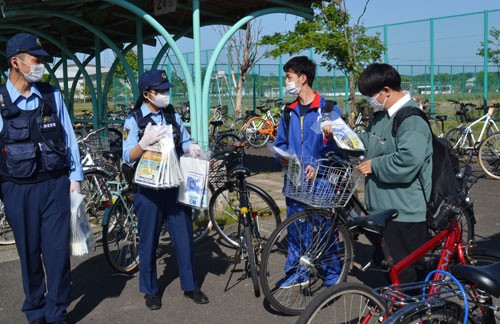 [写真/自転車通学の生徒に盗難注意を呼び掛ける警察官ら ]