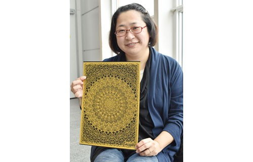 [写真/パリに出品した作品の3分の1の大きさの切り絵を手にする樫尾さん ]