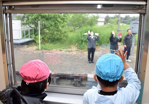 [写真/保護者の登場に園児たちも驚いた(落石駅) ]