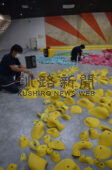 [写真/壁を登る時につかむホールドの抗菌作業を行う高橋社長(左) ]