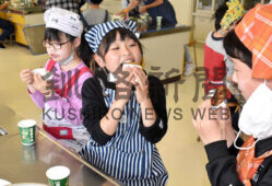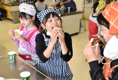 [写真/エゾシカのメンチカツを味わう児童たち ]