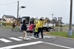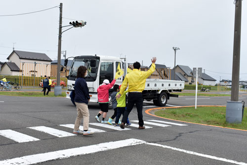 [写真/指導を受けながら手を上げて横断歩道を渡る子供たち ]