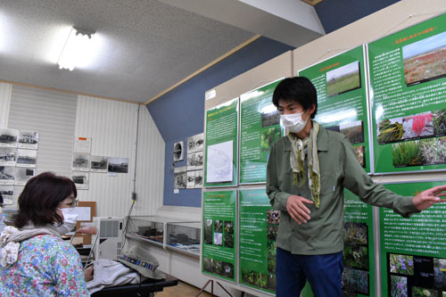 [写真/野付半島の植生調査について説明する深津研究員 ]