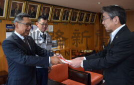 [写真/蝦名市長に目録を手渡す杉本社長(左) ]