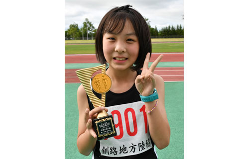 [写真/女子小学5・6年80㍍障害で大会新を出した小野 ]